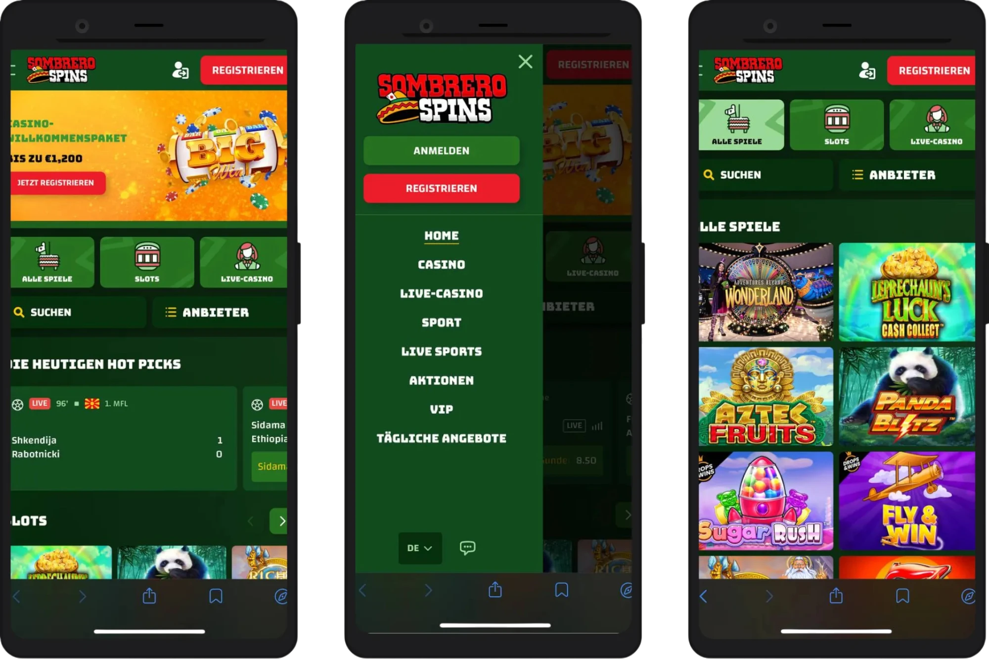 Sombrero Spins bietet ein vollständig optimiertes mobiles Spielerlebnis, das sowohl über den Browser als auch über die eigene App reibungslos funktioniert. Die mobile Website ist übersichtlich, schnell und mit allen Funktionen der Desktop-Version ausgestattet – einschließlich Slots, Live-Casino, Sportbereich sowie Ein- und Auszahlungen.