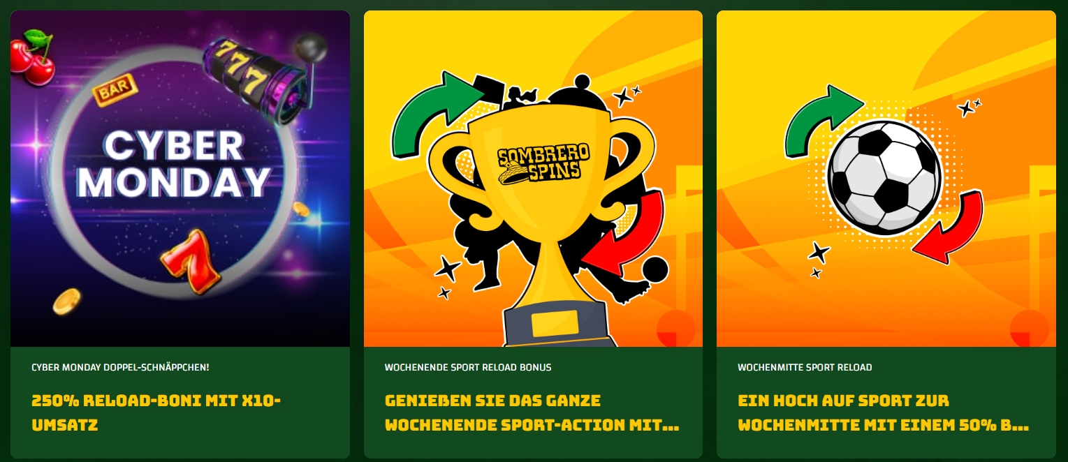 Im Sombrero Spins Casino erwartet Spieler eine abwechslungsreiche Auswahl an Bonusangeboten – von einem großzügigen Willkommenspaket mit bis zu 3.000 € und 1.000 Freispielen bis hin zu attraktiven Sportwettenboni und regelmäßigen Reload-Aktionen. Die Promotionen sind klar strukturiert, mit transparenten Umsatzbedingungen und verschiedenen Optionen für Casino- und Sportfans.