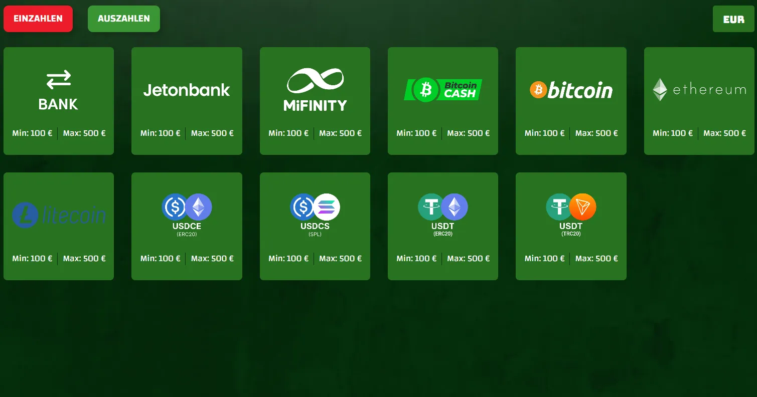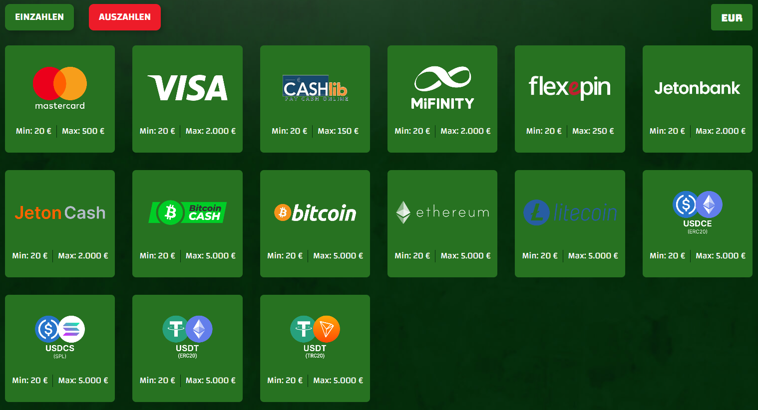 Für Krypto-Nutzer stehen BTC, ETH, LTC, USDT und USDC mit großzügigen Limits von 20 bis 5.000 € zur Verfügung. Alle Einzahlungen werden sofort verarbeitet und sind komplett gebührenfrei.