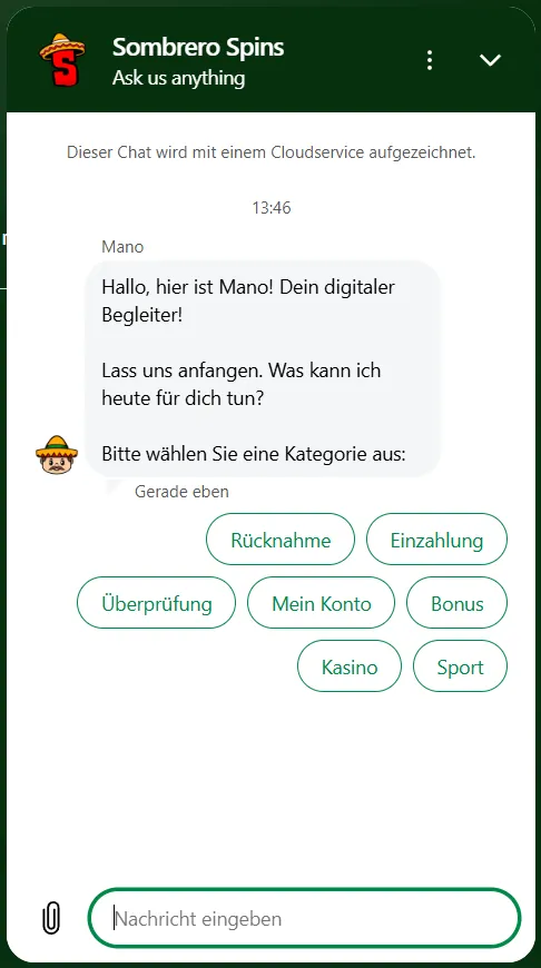 Einzahlungen werden bei Sombrero Spins sofort verbucht, unabhängig von der Zahlungsmethode.